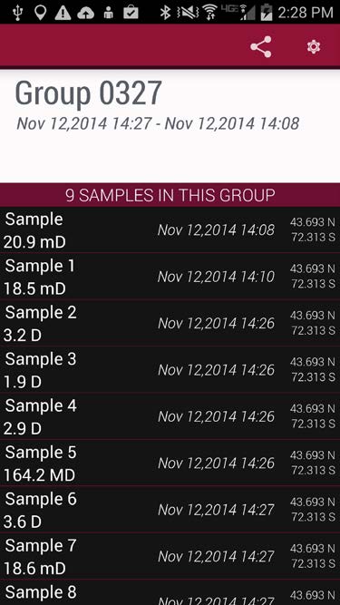 测量数据,连同gps导出的纬度和经度坐标、TinyPerm渗透率仪序列号、日期、气压、环境温度和湿度,以及样本图像,都被捕获到数据文件中,这些数据文件可以很容易地从Android设备导出到桌面电脑,以进行额外的分析。